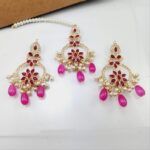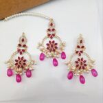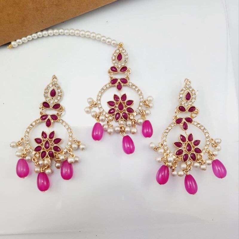 Cubic Zirconia Chandbali Earrings and Matha Tikka with Magenta Pearl Beads